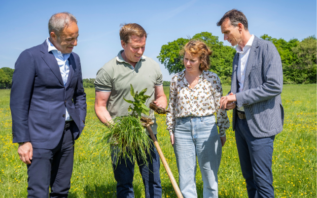 Foto: V.l.n.r. Tuncay Özgüner (President FrieslandCampina Retail & Americas), melkveehouder André de Groot, Eline van der Mast (Manager Voedselsysteemperspectief ReGeNL) en Erik van den Hoogen (CCO/Directeur Inkoop en Marketing Lidl Nederland).